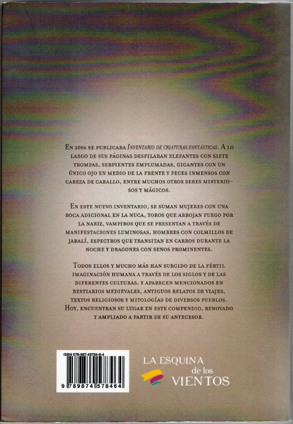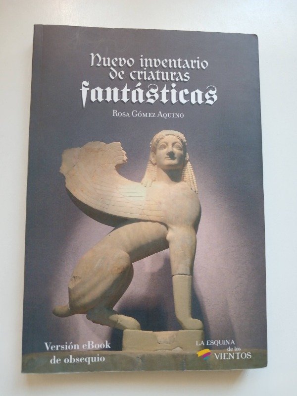 Nuevo inventario de criaturas fantásticas, de Rosa Gómez Aquino, es una enciclopedia mitológica y de lo fantástico que reúne descripciones de más de trescientas criaturas imaginarias, mitológicas y legendarias provenientes de distintas culturas y épocas, organizada de manera alfabética para facilitar su consulta. El libro presenta seres como duendes maléficos, gigantes de un solo ojo, caballos alados, serpientes emplumadas, un perro de tres cabezas que guarda las puertas del inframundo, aves que renacen de sus cenizas y muchas otras figuras fantásticas, mostrando cómo la imaginación humana ha creado una fauna mítica rica y diversa a lo largo del tiempo. Además de las descripciones de cada criatura, la autora introduce conceptos sobre cómo se crean estas figuras fantásticas y reflexiona sobre los mitos, leyendas y procedimientos creativos que subyacen a estas historias, convirtiendo el libro en una guía tanto informativa como inspiradora para lectores interesados en mitología, literatura fantástica o la creatividad cultural.