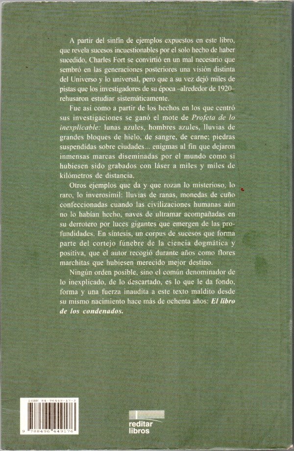 A partir del sinfín de ejemplos expuestos en este libro, que revela sucesos incuestionables por el solo hecho de haber sucedido, Charles Fort se convirtió en un mal necesario que sembró en las generaciones posteriores una visión distinta del Universo y lo universal, pero que a su vez dejó miles de pistas que los investigadores de su época -alrededor de 1920- rehusaron estudiar sistemáticamente. Abarca casi todo el espectro de rarezas que uno pueda imaginar: alienígenas, objetos extraños caídos del cielo -algunos de ellos, orgánicos, peces y sapos incluidos- seres mitológicos y no tanto, desapariciones de personas, curiosidades climáticas, etc. Se considera al Libro de los condenados como el primer estudio con pretensiones científicas sobre estas anomalías.